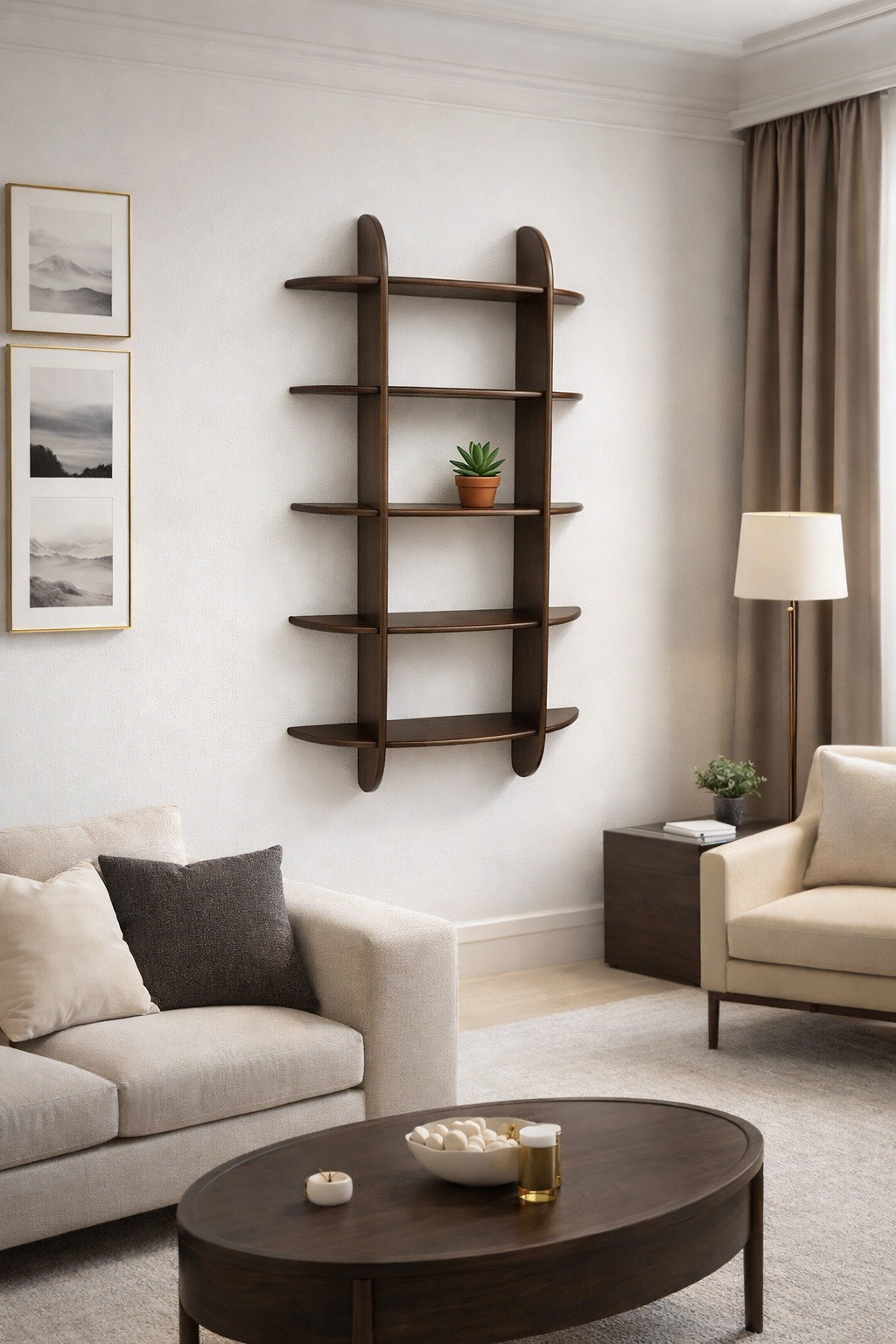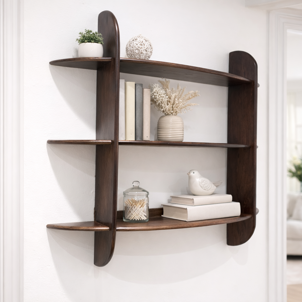 המדף משלב פונקציונליות ועיצוב חמים, ומתאים להצגת ספרים, חפצי נוי וצמחים.