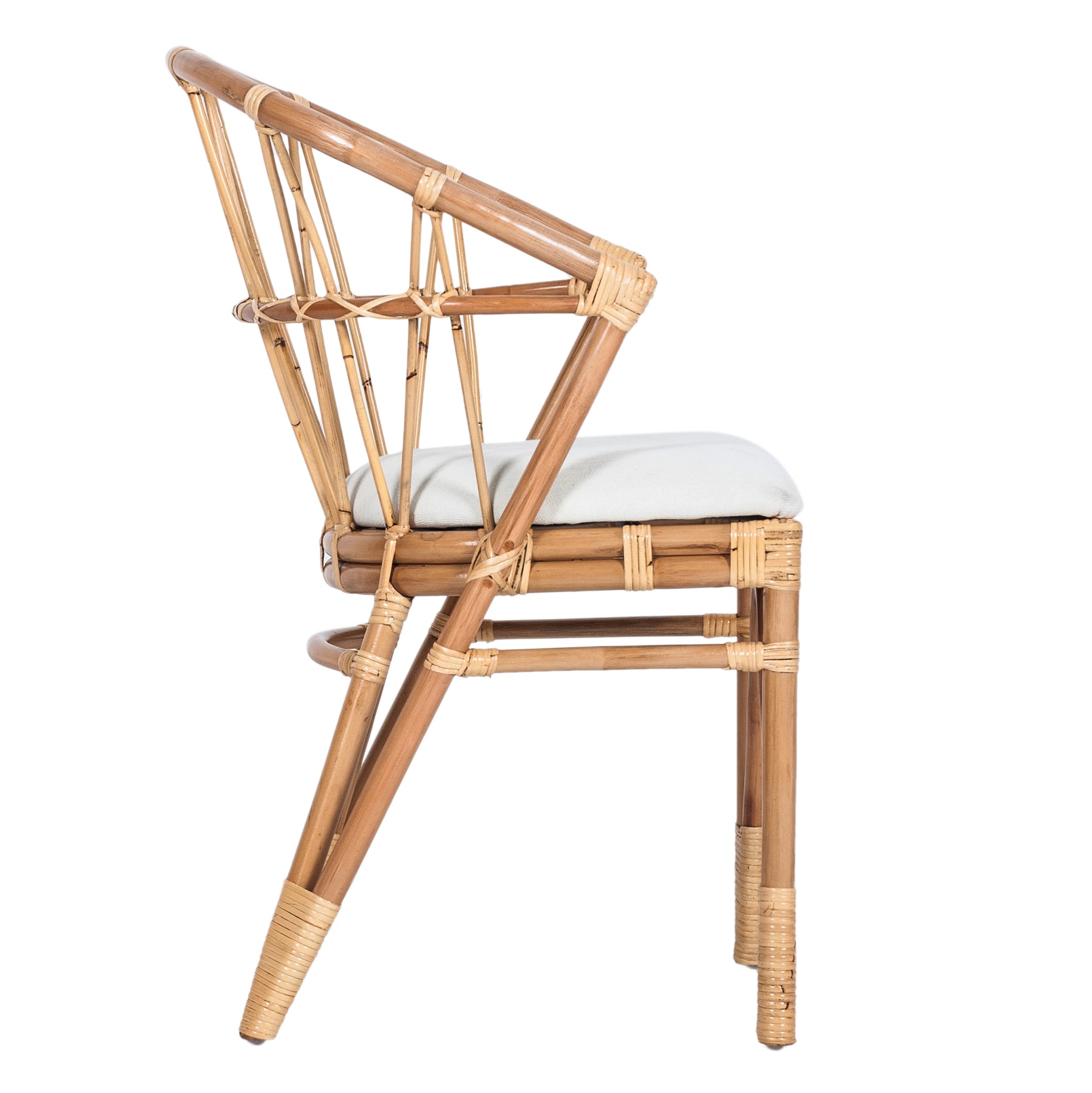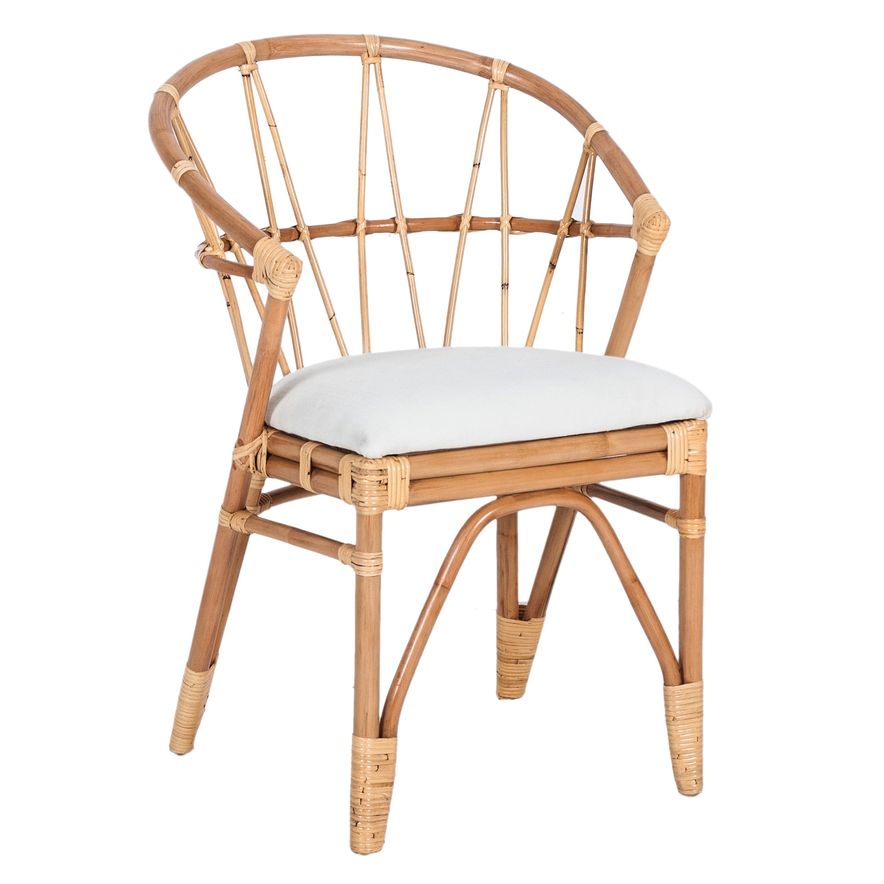 כורסאת עשויה בעבודת יד מסורתית מראטן טבעי, בעיצוב קלאסי עם נגיעות מודרניות. המבנה הקליל והמעוגל מעניק לה נוכחות רכה ומזמינה, בעוד שהמושב המרופד בבד בגוון בהיר מוסיף שכבת נוחות מושלמת.